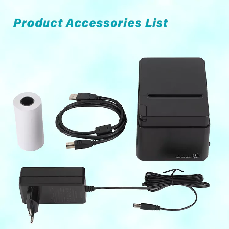 1. Pakken inkluderer: 80 mm kvitteringsskriver, papirrull, usb-kabel, manualer, adapter.