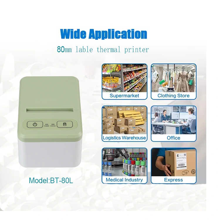 Designkonseptet til vår termiske fargeetikettskriver er å gjøre det mulig for kunder å bruke den i fabrikklagersystemer, små butikker som trenger å skrive ut små etiketter, for å skrive ut små etiketter, strekkoder, fraktmerker, klistremerker osv. 80L-modellen kan støtte utskrift i bredder fra 20 til 80 mm, noe som gjør den egnet for ulike kunder med ulike behov. Den er designet for å være kompakt i størrelse, noe som gjør den praktisk å bære og plassere.